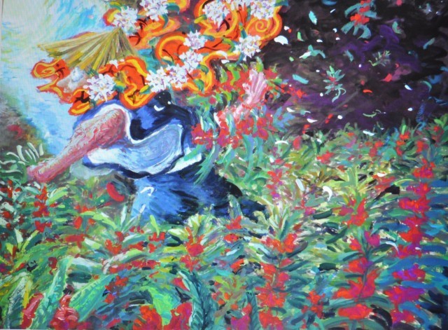作品名:バケモノダンスフロア…歌詞から仏教的な印象を受け、仏教徒が自己研鑽を積む姿を想像しました。紙の下半分を占めるホウセンカは、花言葉が精神的に未熟なニュアンスだったので克服すべき対象に見立てました。口から出てる花はジンチョウゲといい、花言葉が宗教的な意味を持っていたので、念仏のように表現しました。影には高彩度な色を使用し、全体の色味にメリハリをつけました。