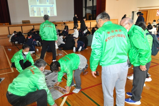 今日1,2限はNPO法人ふるさと未来創造堂から中野事務局長、中野コーディネーターをお迎えして、体育館と集会室に分かれて防止教室を行いました。地震に対する備えや、避難所での新聞紙を使ったスリッパづくりの体験など、まちづくり協議会の皆様も一緒に参加してくださいました。災害は他人事ではありません。常に心の準備をしておきましょう。