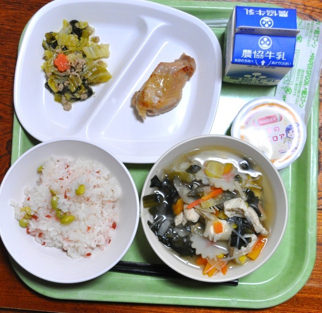 外は寒いけれど、今日の給食は華やかです‼『20周年お祝い燕の野菜とひき肉の炒め物』『ルレクチェソースのチキンソテー』『桜咲け!燕の混ぜ込みごはん』『パーティーポッパー汁』『飛燕舞のババロア』牛乳の計795Kcalで寒い冬を乗り切ろう‼