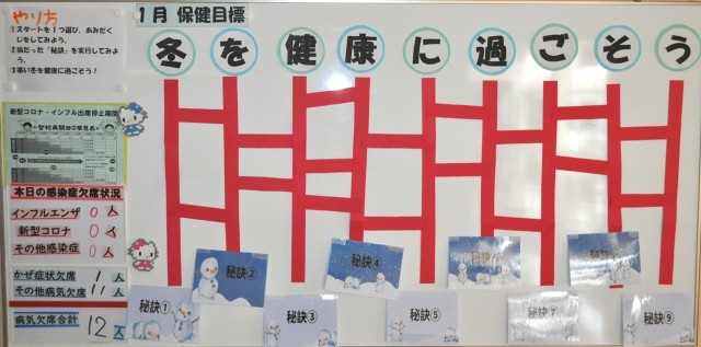1月の保健目標は「冬を健康に過ごそう」です。寒い日が続きます。3年生は来週から私立受験が始まります。ベストコンディションで臨めるように、細心の注意を払ってすごしましょう。早寝早起き、規則正しい生活が第一ですよ!