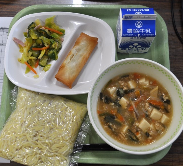 そろそろ麺行きたい気分かな?今日のメニューは中華サラダ 春巻き マーボーラーメン 牛乳の計914Kcalです。天候も少し落ち着いてきました。午後も頑張っていきましょう‼