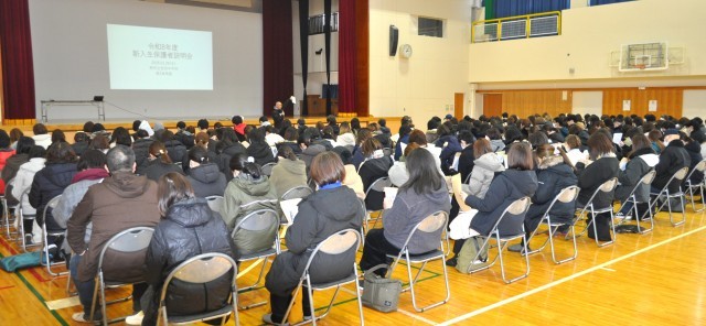 外は幸い穏やかな天気ですが、体育館の中は相当冷えていました。新入学生の保護者の方々に来校いただき、入学まで様々な準備について説明がされているところです。現在小6の皆さん、みんなでお待ちしていますよ‼