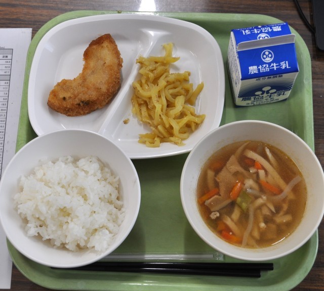たくあんきんぴら 麩っカツ 飛燕舞 ほたて入りのっぺい汁 牛乳の計727Kcalです。今日は平成に新潟で生まれた料理です。おいしかったです。ごちそうさまでした‼