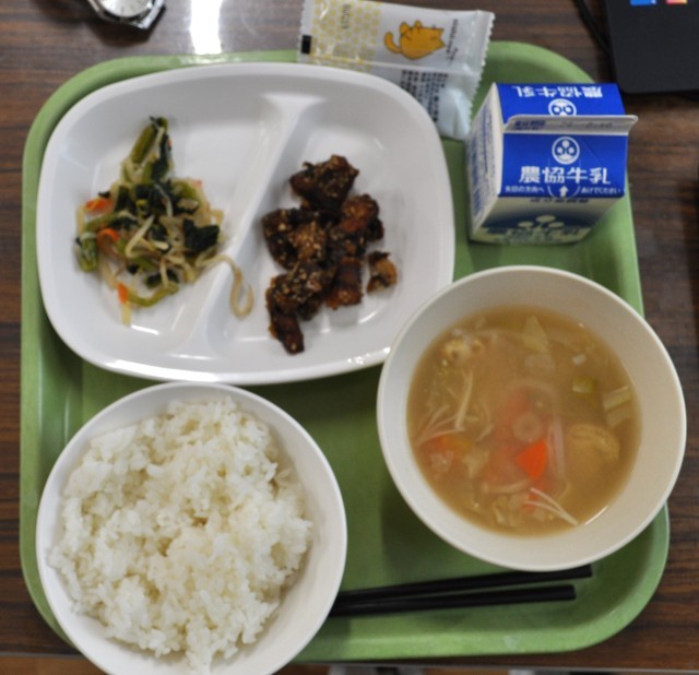 今日は節分献立。ごはん おひたし イワシの胡麻がらめ 白菜の具だくさん汁 牛乳の計753Kcalです‼
