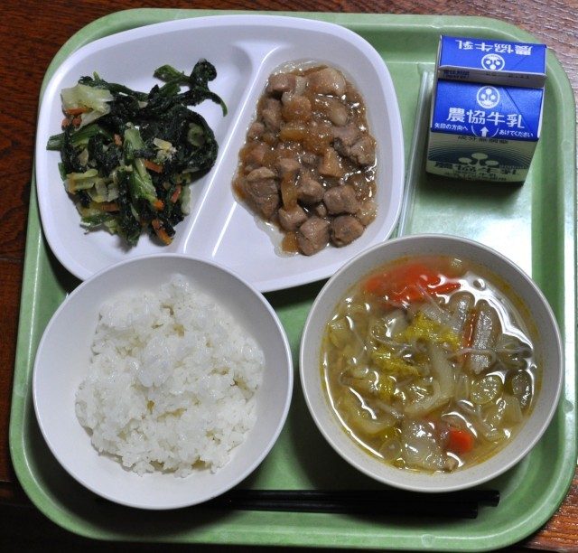 暦の上ではもう春‼早く来てくれ~!今日のメニューは ごはん アーモンド和え 豚肉の赤ワイン煮 さつま汁 牛乳の計787Kcalです。