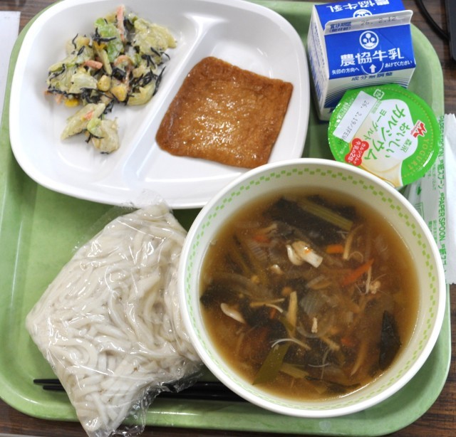 ひじきのごまネーズ和え 油揚げの含め煮 米粉麺 和風汁 牛乳の計724Kcalです。このまま春に行ってもらいたい、そんなお昼時です。