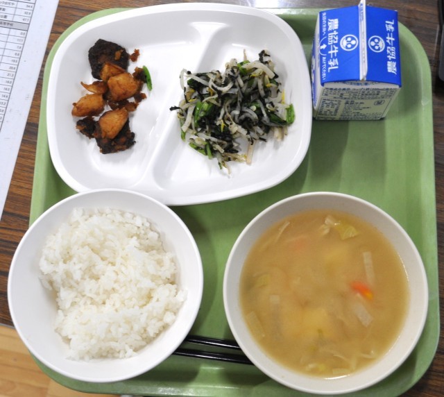 礒香あえ レバーとポテトの揚げ物 ごはん 打ち豆入りみそ汁 牛乳の計738Kcalです。今のところ比較的皆さん健康なようです。来週もインフルエンザに十分注意しながら、睡眠・運動・食事、しっかりやっていきましょう!
