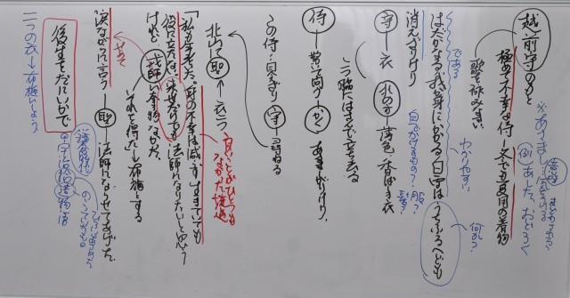 今日質問に来てくれたのは理科(滑車と力)と国語(古文)。理科は問題に対する考え方を伝授したつもり。古文は時間が来たので、一旦預かり。厚い壁だけれど、皆で突破しましょう‼(写真は古文。ホワイトボードにまとめました。明日の昼休み、校長室でお待ちしています。関連は「校長vision」をご覧ください)