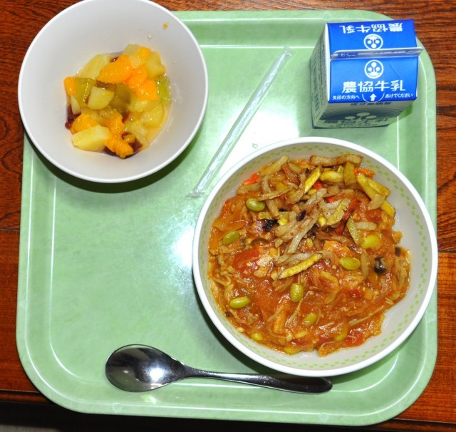 トマトみそカレー豚丼 フルーツポンチ 牛乳の計870kcalです。「去る三月」が始まりました。明日は卒業式の予行練習。水曜日は入試と続きます。健康に乗り切っていきましょう‼