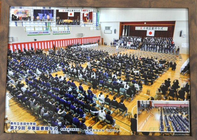 伊藤写真館様から卒業式の一枚をいただきました。これまでの体育祭での一枚に代わって2階踊り場に掲示させていただきます。