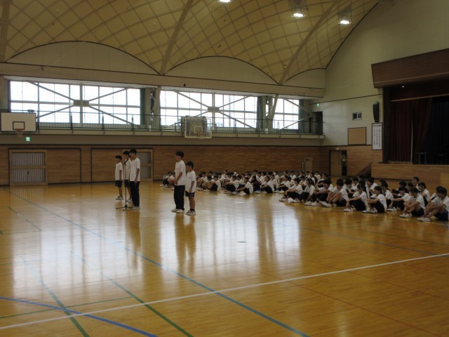 3年生が引退して1・2年生による新チームになってから初の公式戦の結果を、各部部長が全校生徒に報告し、その後表彰と全校エールを行いました。
