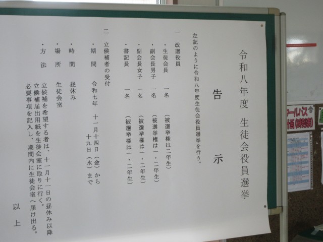 11月11日(火)に令和8年度生徒会役員選挙の告示が行われました。